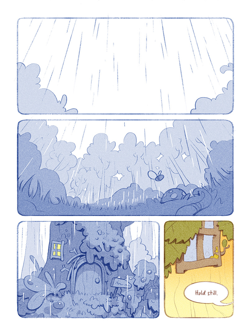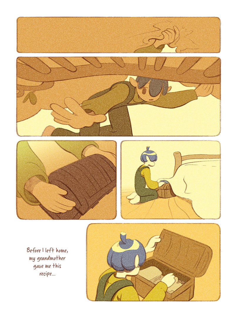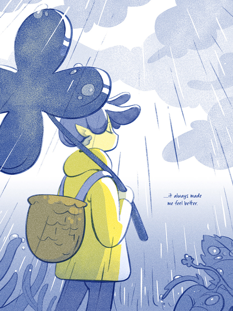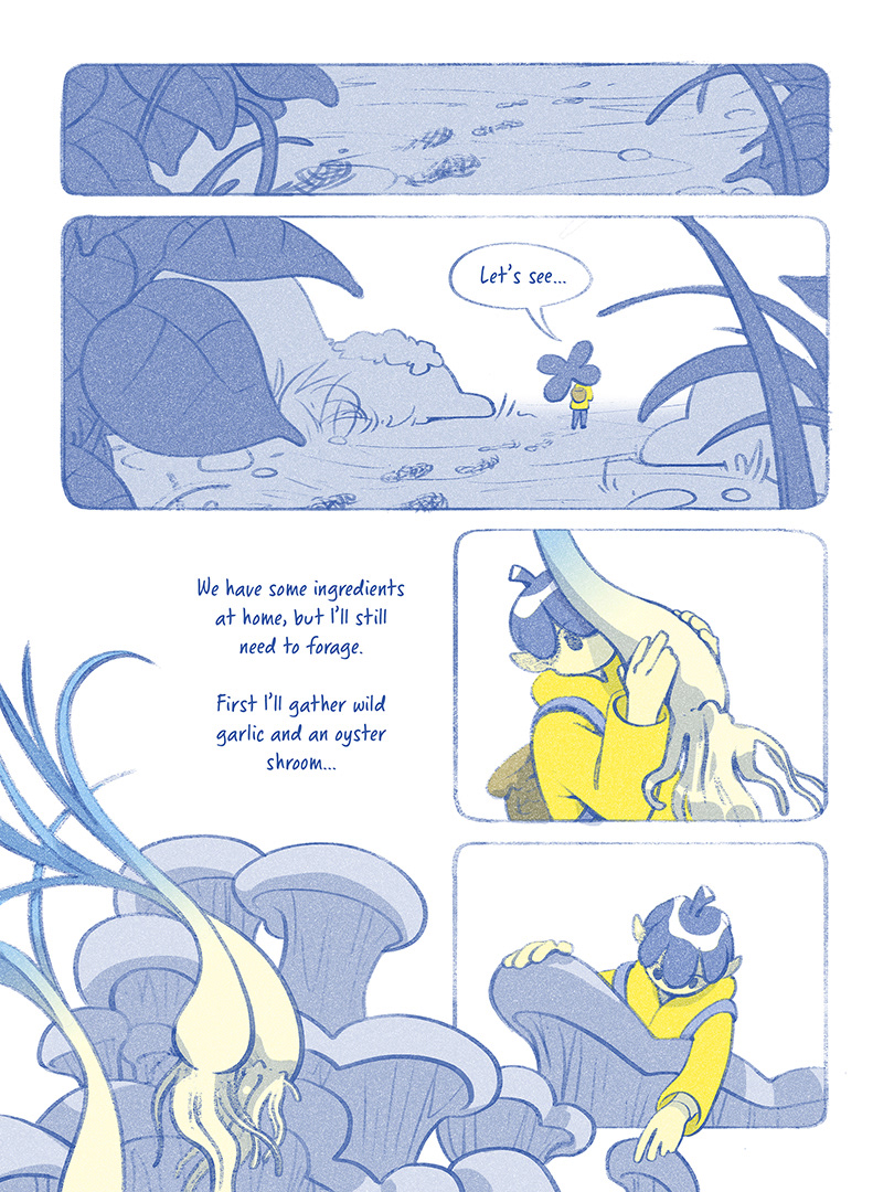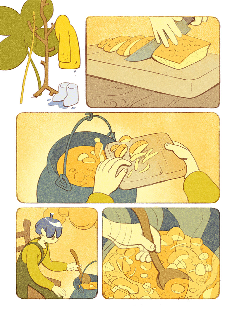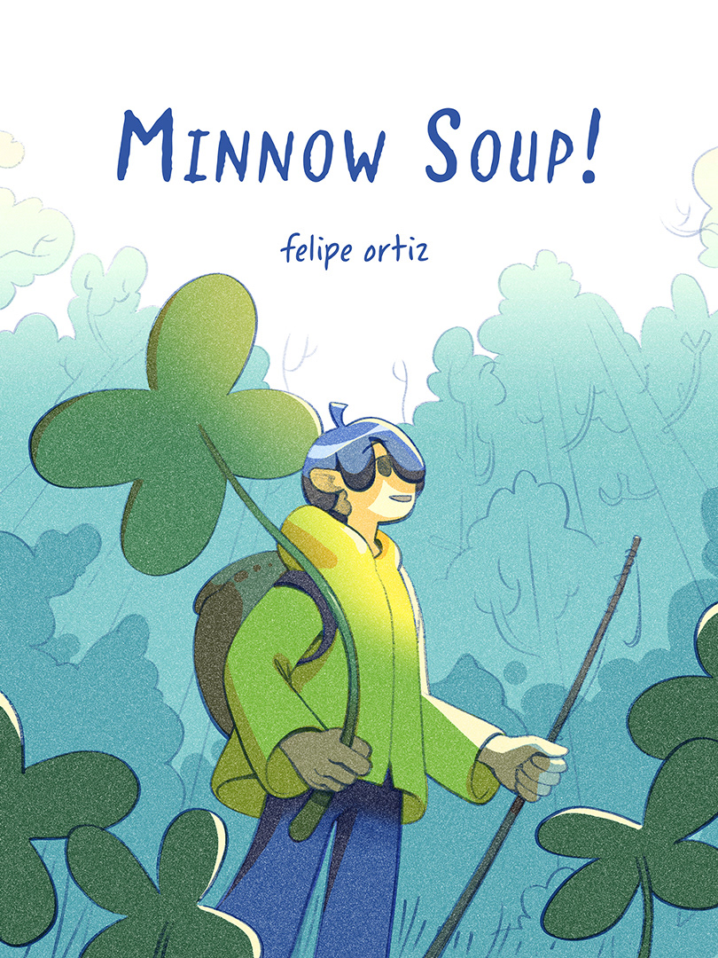 A tiny forest creature delves into the woods to find ingredients so they can prepare their grandmother’s special minnow soup for a loved one. A cozy comic best served warm on rainy days. Created for Shortbox Comics Fair 2023.